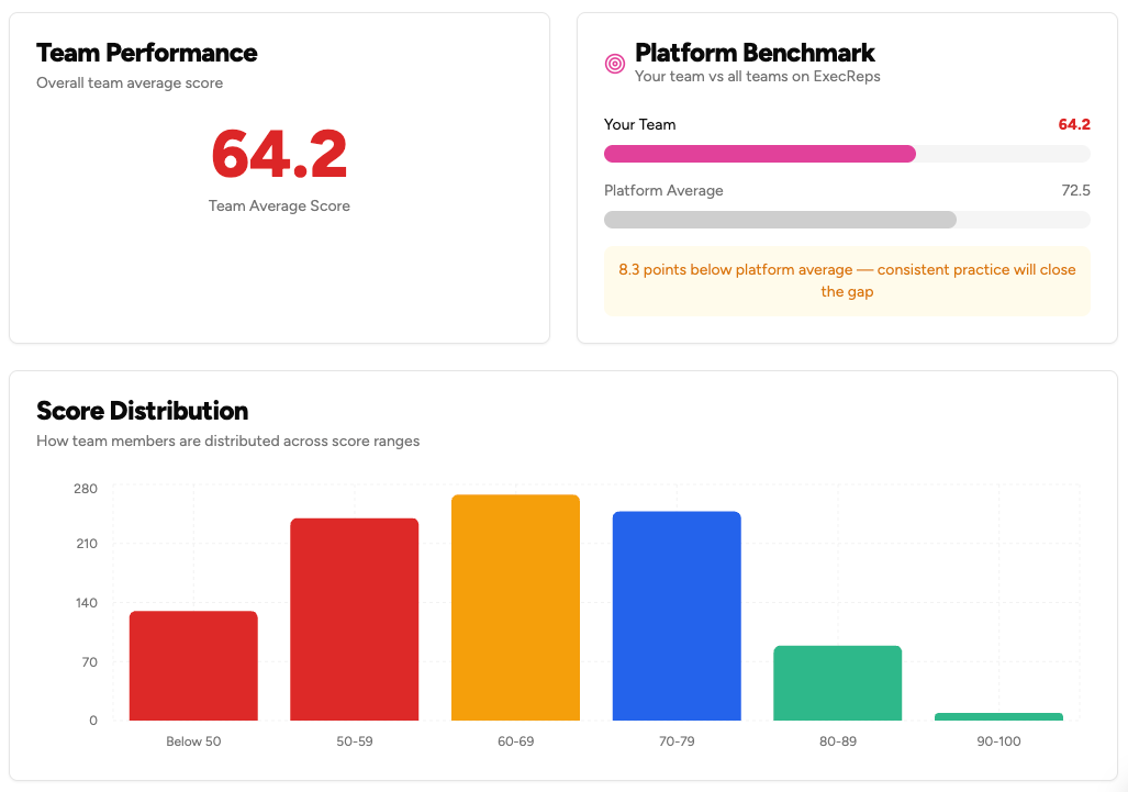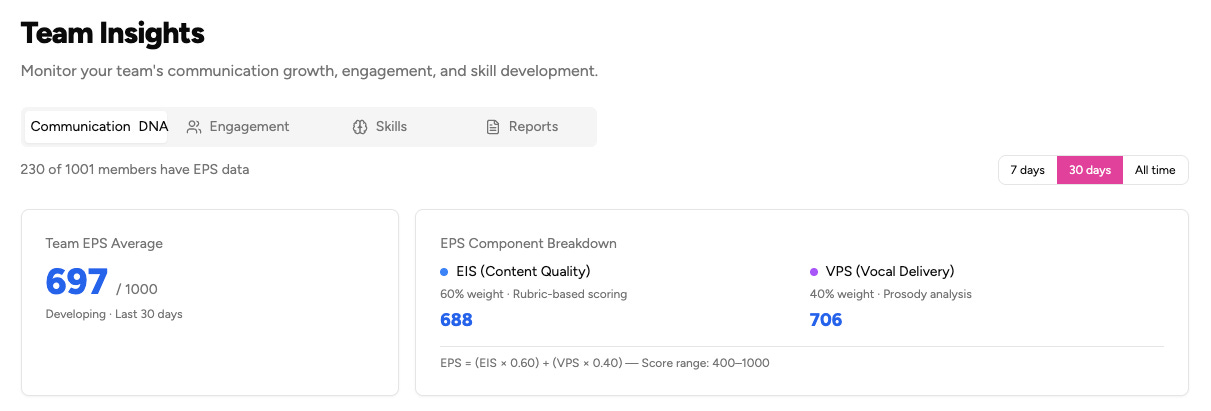Managers see trends, not transcripts. They see that someone’s EPS has improved 15% over the last month, not that they bombed a specific practice session on Tuesday. They see engagement patterns, who’s practicing regularly, but not the content of what anyone practiced. The individual owns their detailed data. The team sees the trajectory.